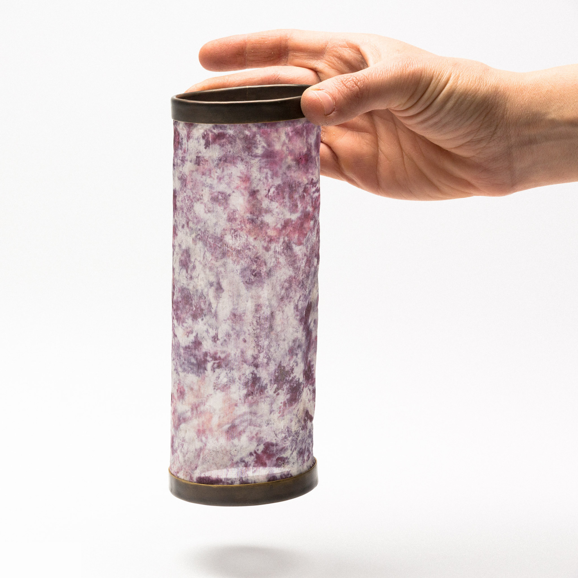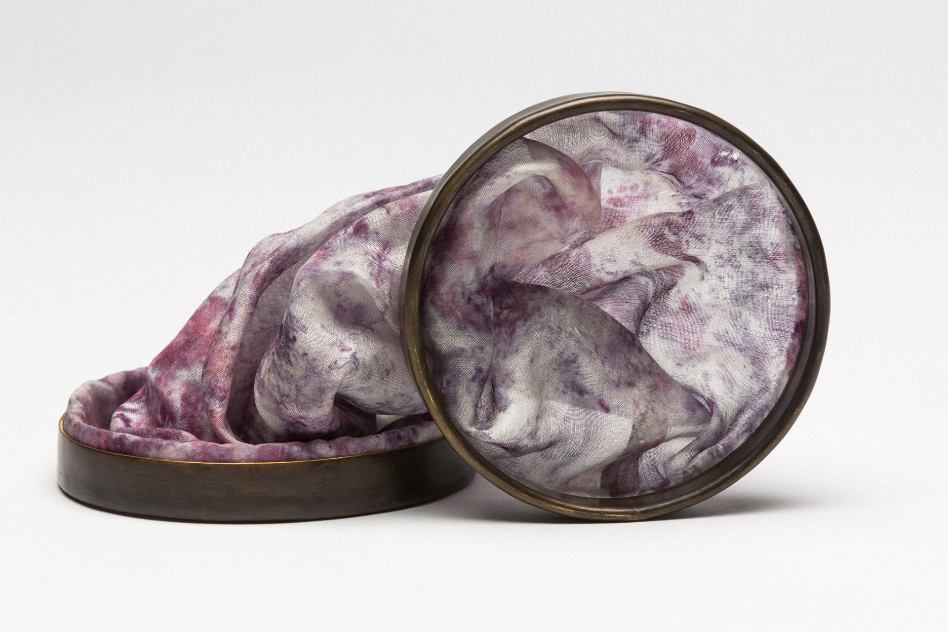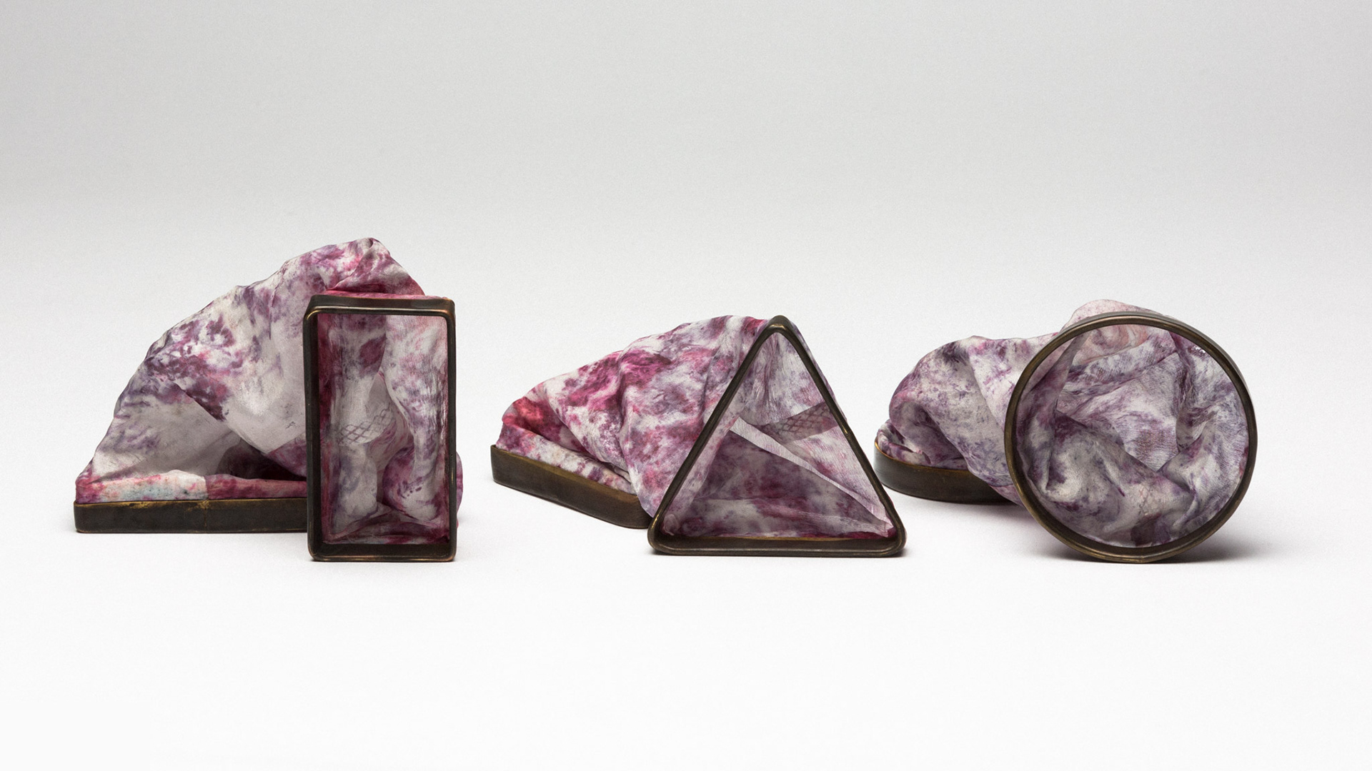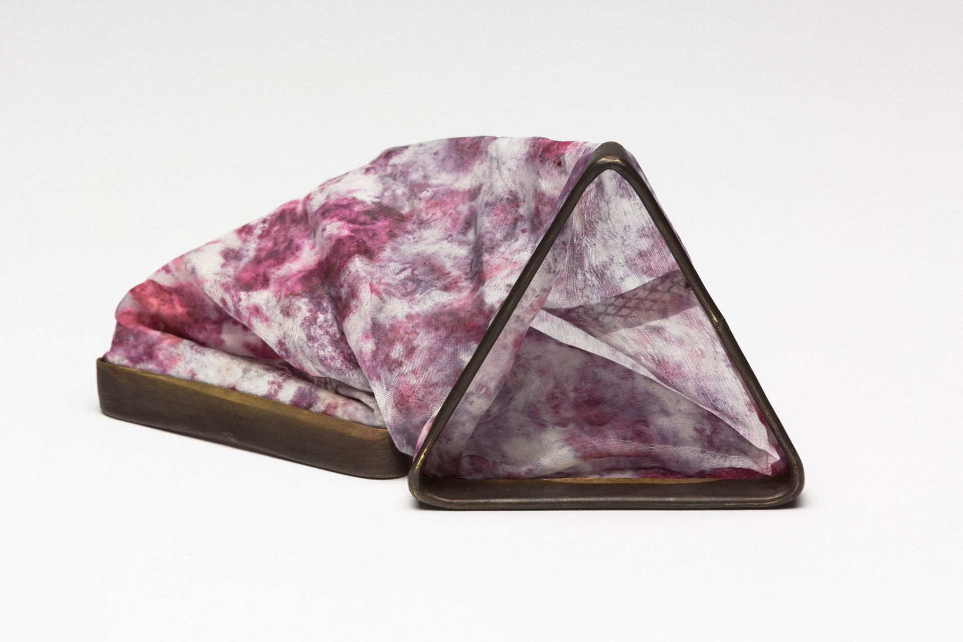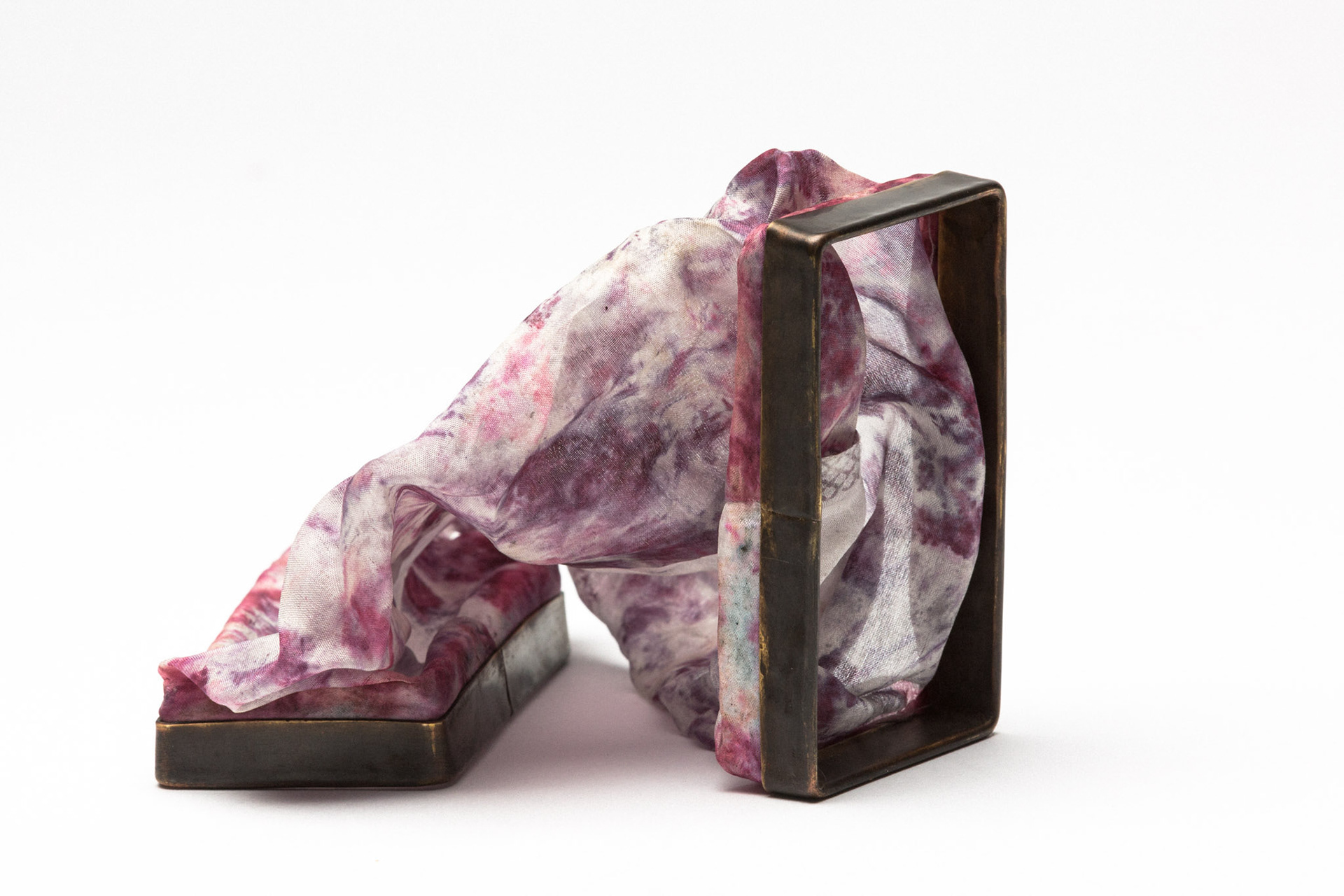 Silk is a series of bracelets that combined textile and goldsmith techniques by connecting fine silk and metal (brass) fabric. The coloring of the fabric was handmade in a type of printing method, done by the gentle hammering of dry, wet vine leaves on the fabric. The challenge in such a project is to connect the metal and the fabric in a way that would fit these two opposing materials.